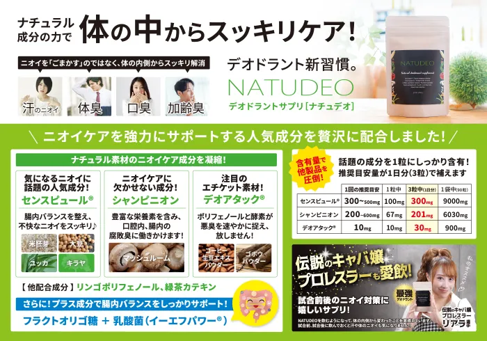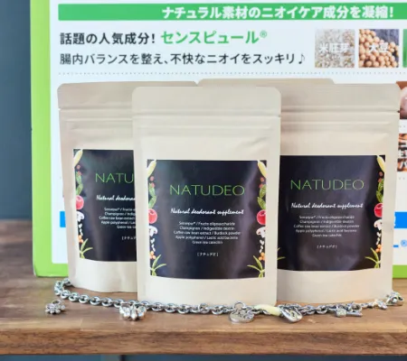 Closeup Itemクローズアップ商品 2026.3.6 Puremoni 大阪のレポートを見る NatureCuore株式会社 NATUDEO(ナチュデオ) 自然由来の人気消臭成分を圧倒的含有量で配合したデオドラントサプリ「NATUDEO(ナチュデオ)」は、腸内バランスを整え、体の中から不快なニオイをスッキリ解消します! NATUDEO(ナチュデオ) 購入サイト 2026.3.6 Puremoni 大阪のレポートを見る