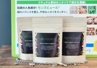 NATUDEOは、植物・穀物から発酵抽出された、悪臭を抑える成分センスピュール®、マッシュルームから抽出された、口腔内や腸内の腐敗臭を抑える作用があるシャンピニオン、植物由来のポリフェノールが持つニオイへの働きを酵素の力で消化したデオアタック®など、ニオイケアに人気の5つ成分に加え、腸内バランスを整える乳酸菌やフラクトオリゴ糖の2つの貴重な成分が贅沢に配合されたサプリメントです。